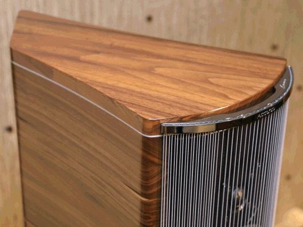 从外观来看,Essence很明显是从Accordo脱胎而来,将原本是书架型式、2单体2音路架构,延展为落地款式、3单体3音路架构,音箱则维持原先前宽厚窄的不规则造型。由于Essence增加了一颗180mm低音单体,音箱宽度也略增,变成23公分,高度为110公分,算是中小型尺寸的落地喇叭。