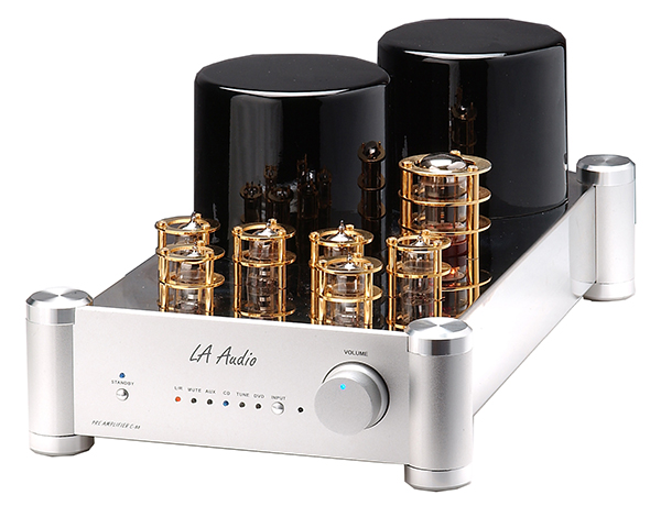 LA Audio推出的C-88R真空管前级,机箱采用抛光不锈钢制作,四根突出醒目的圆形脚柱,在机箱四角支撑整部机器。前面板以LED灯号显示输入档位,音量旋钮上也有一个蓝色LED灯,清楚标示出当前的工作状态。